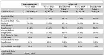 Washington University in St. Louis has negotiated new predetermined fringe benefit rates with our Federal cognizant agency, the Department of Health and Human Services. These rates and the applicable rate agreement are effective for the period July 1, 2025 through June 30, 2026, see below: