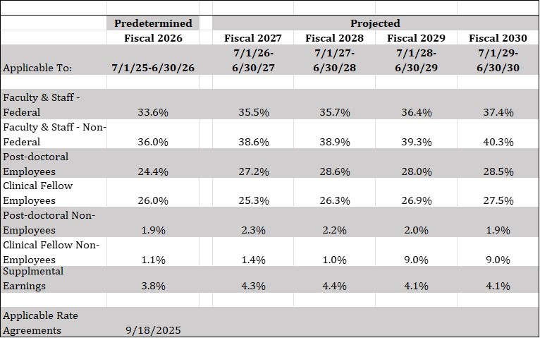 Washington University in St. Louis has negotiated new predetermined fringe benefit rates with our Federal cognizant agency, the Department of Health and Human Services. These rates and the applicable rate agreement are effective for the period July 1, 2025 through June 30, 2026, see below: